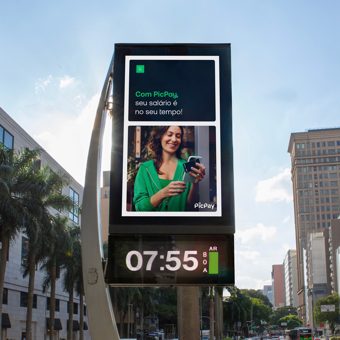 Criar uma linguagem visual capaz de transitar com fluidez entre o ambiente digital e o espaço físico, garantindo consistência de marca em uma fintech altamente dinâmica e competitiva, assegurando forte reconhecimento visual, clareza na comunicação de benefícios e funcionalidades, adaptabilidade a múltiplos formatos e escalas e agilidade nos desdobramentos, tudo isso preservando o posicionamento inovador e acessível do PicPay.
